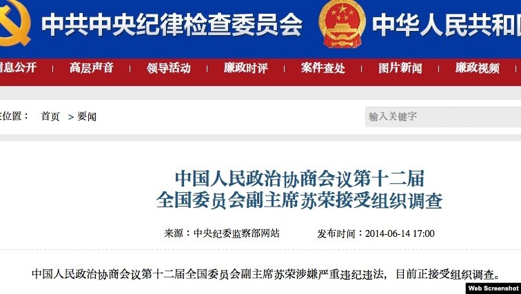 香港 — 中纪委监察部网站6月14日下午证实,曾任青海、甘肃及江西三省省委书记的现任全国政协副主席苏荣,涉嫌严重违纪违法,目前在接受调查。66岁的苏荣成为十八大以来首位落马的国家领导人或副国级高官,也是继前政治局委员、重庆市委书记薄熙来之后,被调查的最高级别的官员。