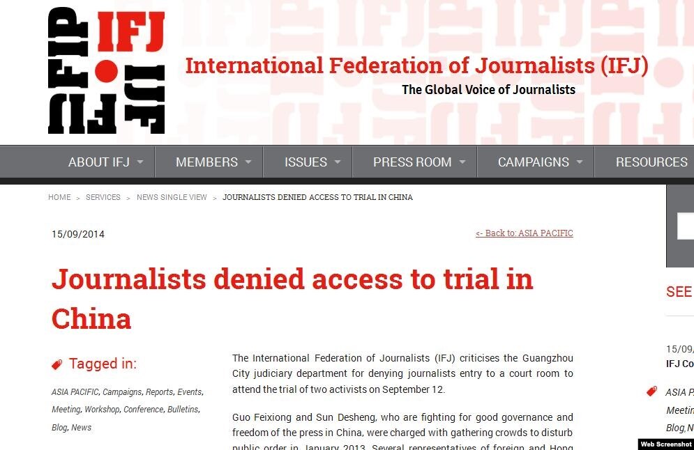 世界最大的记者组织国际记者联合会星期一发表新闻稿,批评中国广东司法当局不允许记者旁听法院对民主活动人士郭飞雄和孙德胜的审判。