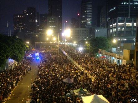 星期天凌晨开始的占中行动,星期二晚从原来的中环、金钟、湾仔、铜锣湾和旺角,扩展至九龙闹市区尖沙咀的广东道和海防道一带,参与的人数继续增加,到9点以后最高峰时估计超过20万人。
