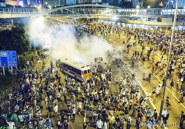 催泪弹变成一个有形而具体的“镇压标志”,不仅激化了局势,促使更多普通市民走出来坐在马路上,也实际上加剧了运动性质的转化:这已经不是由几个领袖人物发起的“佔领中环”运动,也不只是学联或者学民思潮发起的学生运动,而成了一场因为“敌人”团结起来的,真正去中心化的全民运动。
