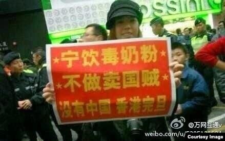 在中国社交网站上一张照片广泛流传。照片上一位中年妇女在街头打出“宁饮毒奶粉,不当卖国贼”的标语,反对香港民众的占中行为。中国大陆曾经爆发在婴儿奶粉中添加有毒物质三聚氰胺的毒奶粉事件,引发中国母亲到香港和海外购买外国奶粉的浪潮。香港奶粉一度被大陆游客抢购一空,港府有关部门不得不采取限购措施。