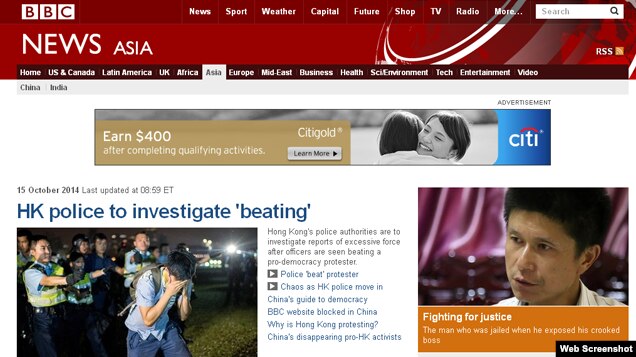 在香港民众争取民主的和平示威活动频遭警方强力干预之际,英国广播公司(BBC)表示,该公司的英文网站在中国已被封锁。