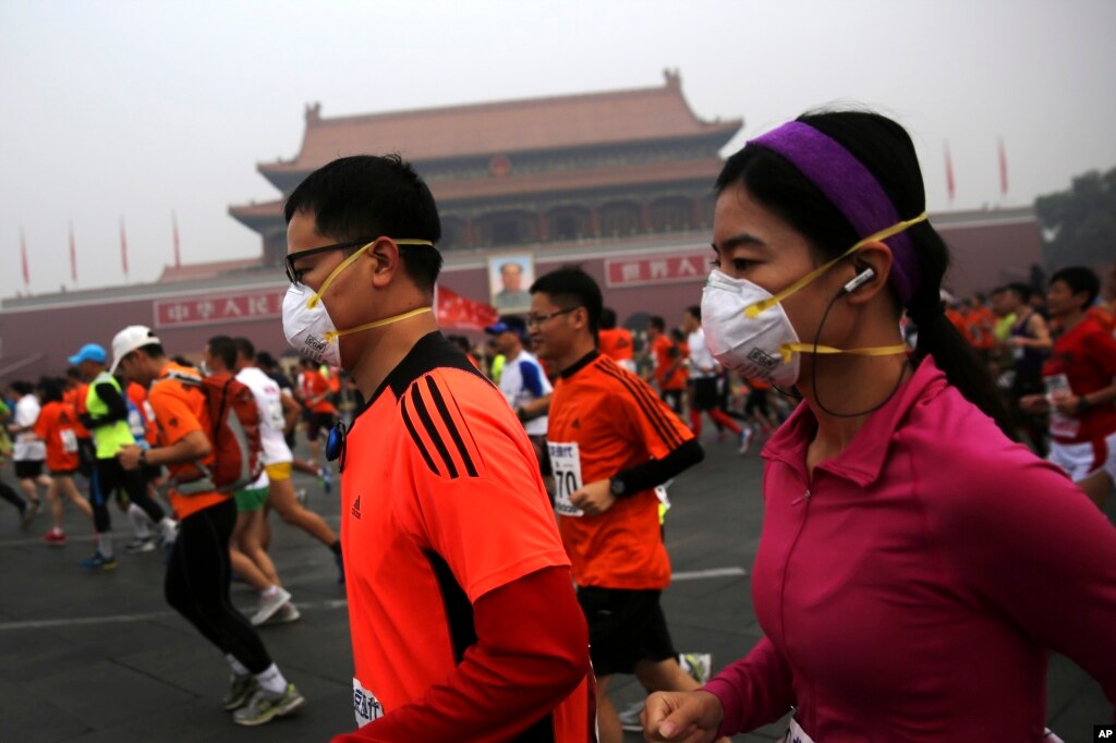 2014年北京国际马拉松赛的参加者戴口罩在雾霾中跑步(2014年10月19日)
