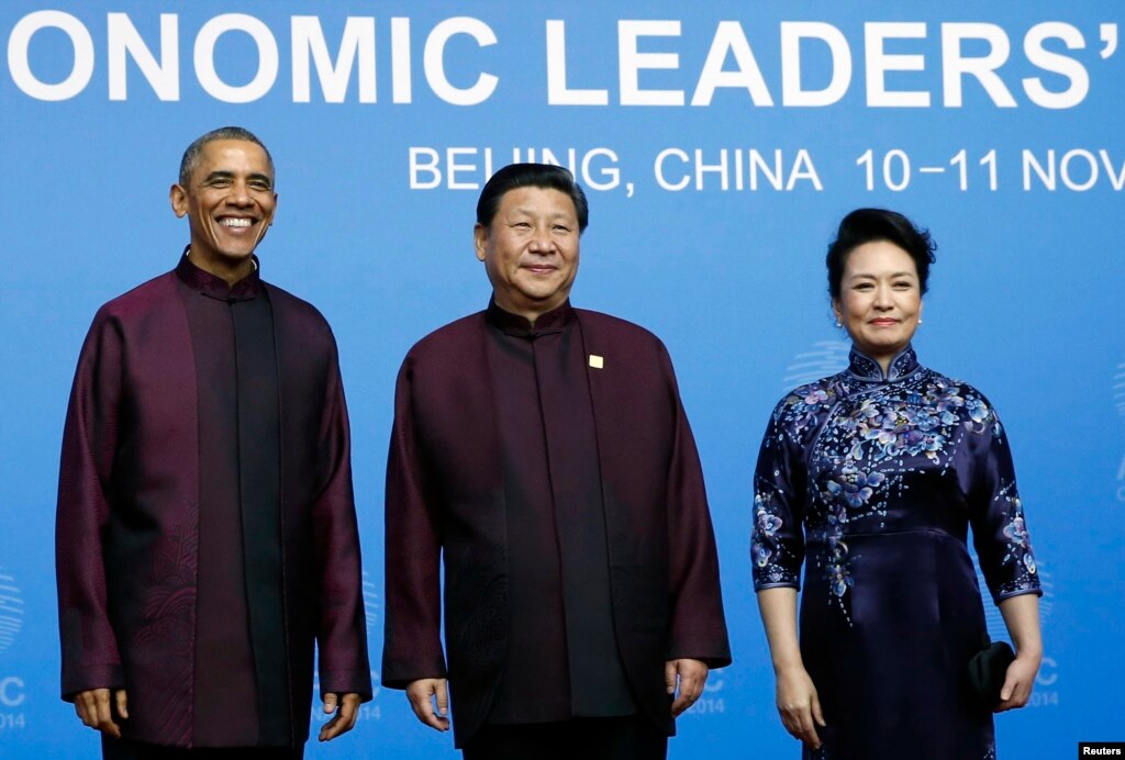 美国总统奥巴马与中国国家主席习近平及夫人彭丽媛在北京举行的欢迎宴会上合影。