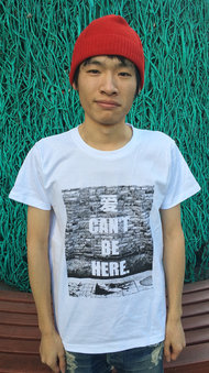 吴吞出售的T恤上的图案是印在砖墙上的“爱Can’t Be Here”字样。