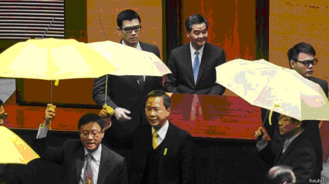香港特首梁振英周三(14日)上午11时发表任内第3份《施政报告》。廿多名立法会泛民议员在梁振英准备发言时举起黄色雨伞,高叫口号后离场抗议,其中两名议员需要由保安人员抬走离开会议室。