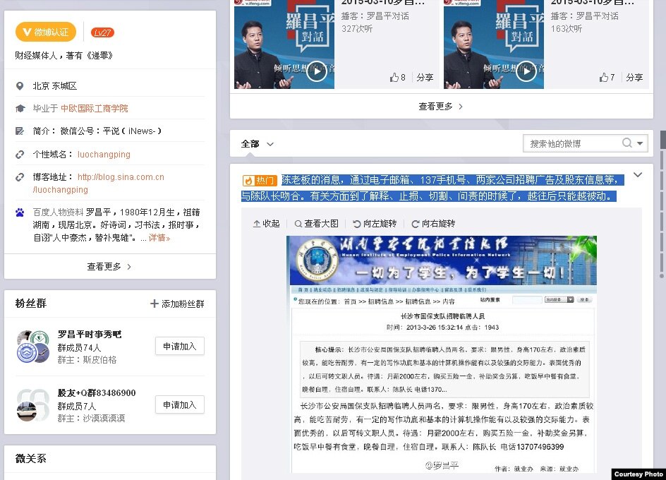 罗昌平发布的网络截图显示,长沙国保支队四大队在湖南警察学院网刊登招聘启事的联系人是陈队长,联系手机是13707496399,另外两家公司广告和股东信息显示的陈经理的手机也是13707496399,是同一个号码。