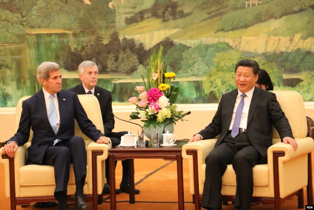 2015年5月17日美国国务卿克里与中国国家主席习近平在北京人民大会堂会谈。(美国之音莉雅拍摄)