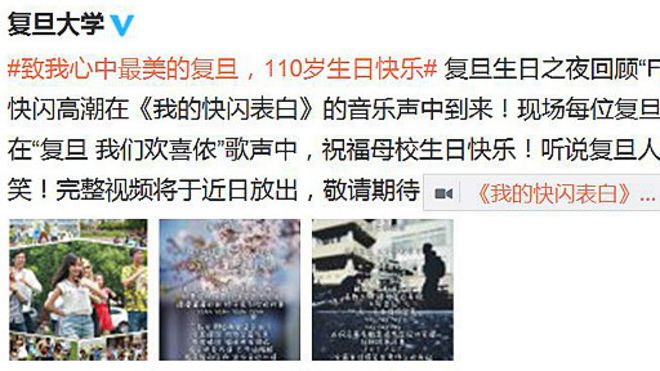 到了周四(28日)下午,这部宣传片已经从复旦大学官方网站、微博、微信公众号等平台全部下线;傍晚6点左右,复旦大学又在官方微信发布了名为《日月光华 旦复旦兮》的另一版本宣传片。