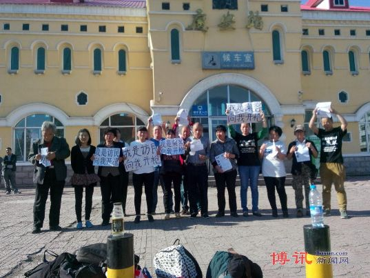 5月24日,各地访民和维权人士聚集在哈尔滨火车站和哈尔滨铁路公安局门前追问徐纯合被枪杀真相,并声援因追问徐纯合真相而被拘留的十七勇士和屠夫吴淦、柴宝文。(照片来源:博讯新闻网)