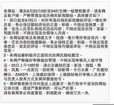 首先,即日起至9月5日,对所有阅兵相关新闻跟帖评论一律先审后发,务必保证跟帖评论的正面、积极,“不得出现抹黑、歪曲、攻击人民军队和阅兵活动内容;不得出现攻击党、国家、制度内容;不得出现攻击领导人内容”。