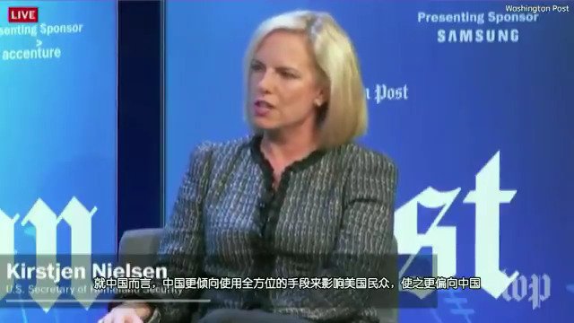 美国国土安全部长吉尔斯腾·尼尔森(Kirstjen Nielsen)星期二(10月2日)说,“就中国而言,#中国 更倾向使用全方位的手段来影响美国民众,使之更偏向中国。俄罗斯现在的侧重点是挑拨我们各方不合,希望在混乱中推进他们的政策。二者手段有点不同,中国的打算看来更长远,动用了各种手段。”