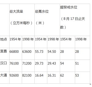 在1998年长江洪水后,原水利部总工程师、长远规划处副处长、全国政协委员陆钦侃先生从上游宜昌、中游汉口和下游大通三个测点上的最大洪水流量、洪水最高水位和超警戒水位的三个数据来分析,说明1998年的洪水远不如1954年大。下面是陆钦侃先生提供的数据: