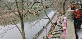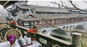 赶到时,老先生正在手机上写帖子,让我等半小时,写完帖子就给我拿资料。我便趁机溜达,观看“铁流水榭”。这地方确实选得好。走廊在水榭二楼,放眼望去,楼下就是味江,也就是“大蜀王祠”正殿大门两旁“日暖味江茶岭白,旗开川峡阵云红”那副楹联上写的味江。祠坐落在味江上游,离水榭仅几公里远。下游百米左右,便是著名的瑞龙桥。古色古香,自东往西,横跨味江,气势如虹。从走廊看下面,沿味江东岸,一路全是茶楼。水榭走廊里也摆着茶座、鱼缸,墙上有字画。濒江邻水,真是饮茶品茗的好地方。(左上图为铁流水榭二楼。左下图为与水榭相距仅百米的瑞龙桥)