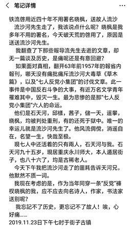 因为我读过铁流在流沙河逝世当天,即去年11月23日下午发的帖子(见上图),铁流在那张帖子中是这样写的:“最为悲惨的是那‘七人反党小集团’六人的命运。他们是石天河,邱樣(应为“漾”),茜子,儲一天,遥攀,晓枫,均被判处重刑,有的还死于獄中。唯一的幸运儿就是流沙河先生了。他风流倜傥,消遥(应为逍遥)自在,名望一生,快哉至极。”所以在对铁流谈上述看法之前,有点担心——担心他听后,会不会拍案而起对我大发雷霆,甚而至于把我赶出水榭?但他却平静地听我说完,没有太多的表示。