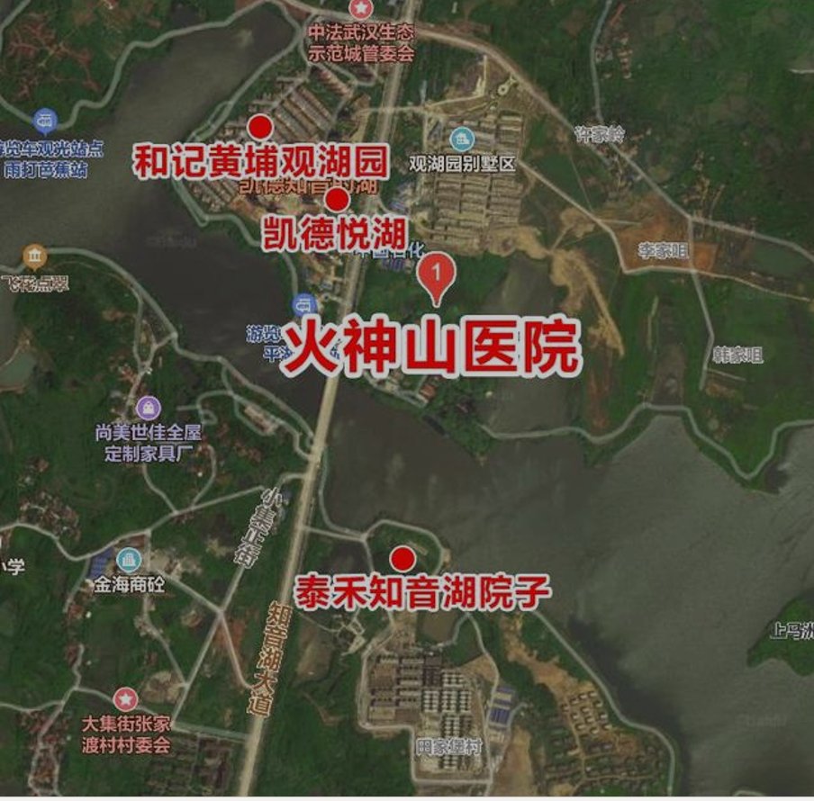 根据名为楼市资本的网友发表的文章,“火神山”医院为别墅豪宅环绕。文章描述道:“知音湖区域一直是武汉楼市中的一个开发热点,很早就吸引了恒大、世茂、和记黄埔、凯德中国、世纪万通、绿地、泰禾等一大批知名房企,落子布局。”火神山医院周边,有四大高端项目颇为瞩目,它们分别是: