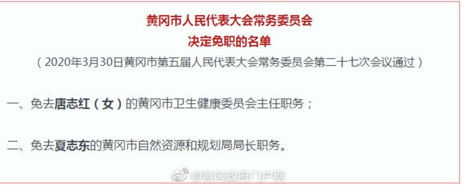 根据湖北省黄冈市人民政府门户网站官方微博@黄冈政府门户网消息,2020年3月30日黄冈市人大常委会会议通过免职决定,免去唐志红黄冈市卫健委主任职务。