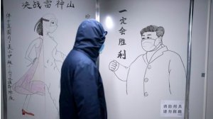 一名工作人员戴着防护面具经过在湖北省武汉市雷神山医院封闭病房内的素描墙,墙上画着中国国家主席习近平的素描照。(2020年4月11日)