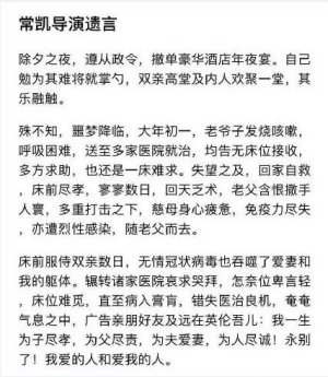 依后来看到的消息,由于她“敲锣”影响了邻居,邻居报警,招来了警察,训斥她不该扰民。可也正是这时候,她不惜敲锣救母的行为引起广大网民关注,并在微信上广泛传播。据说她敲锣的视频当时被不断地删,同时又被网民不断地转发。持续地转发,其影响可想而知,这个时候,估计武汉市领导和湖北省领导全知道了,甚至全世界很可能也知道了,这样,她母亲的床位也就有了。偌大一个武汉市,因家人没有勇气“敲锣”而没能得到及时救治而失去生命的新冠肺炎患者绝不止一两个,读一读湖北电影制片厂常凯主任的遗书就知道我并非信口开河,且不说其父母还都是同济医院的教授,同样一床难求。当时不是有床位,而是确实没床位。敲锣女不是因为敲锣影响太大,其母亲什么时候能得到床位谁也不敢说。