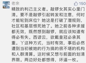 有个网友在跟帖中就是这么说的:“精致的利己主义者。敲锣女其实心里门清。要不是敲锣引起转发和注意,何时才能轮到床位?她这是打破了潜规则,社区和基层恨死她了。她之前各种求援都无效,既然想到敲锣,就应该知道有得必有失。西谚云,欲戴皇冠必承其重。丫这种方式,当时有效,事后必然遭到当初被她的行为搞的很不堪的机构和人群清算。这时候又想与前面的划清界限。两边好处都想得,坏逼一枚。”