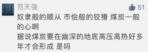 上面说了,敲锣女不笨,智商不会低,但一个人如果思维方式不对,又有什么令她智昏,或者有不可言说的压力,那么这种人的言行就会走样,让正常人感觉不正常。你看上面网友根据国情分析得多么在理。敲锣女的目的虽然达到了,效果也很好,但有笔账当地社区很可能还在记着,那就是让社区受到批评,也就等于给社区抹了黑。当时那么高效救人是不得已,一码归一码,救人归救人,“造成不良影响”或叫“抹黑”也不能就算了。现在就有网友怀疑敲锣女的言行不知是否受到什么人的压力,或者即使不是背后指使也是希望她这么做。有个叫范天强的网友在跟帖中就说了一句含含糊糊但不乏深意的话:“奴隶般的顺从,市侩般的狡猾,煤炭一般的心啊。(可)据说煤炭要在幽深的地底高压高热好多年才会形成,是吗?”