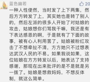 再看另一网友“蓝色幽若”的帖子:“一种人性使然,当时发了上下两集,然后方方转发了上,其实她也是转了别人的,然后左派的很多人开始了对姑娘的攻击,姑娘想你们骂我干嘛,我还是有下表达感恩的啊,于是就有了下面的故事,被有心人利用罢了。姑娘被粉红攻击了不想牵扯不清,方方她只不过想表达武汉人民的不易。如果我说如果,这位姑娘在方方转发以后,她表达了支持感谢,那现在出来批评的是不是就是另一拨了。姑娘是想救妈妈,不想反体制,就这么简单。”