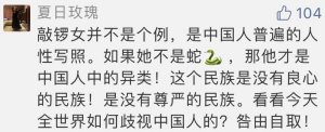 关键是现在越来越多的人都意识到这不只是“敲锣女”的问题,与整个族群有有关系。前几天还有人在公众号就“敲锣女”事件发表文章,题目叫《国人皆是“敲锣女”》,而在《溯源李丽娜敲锣始末》后面的跟帖中有个网名叫“夏日玫瑰”的也是这种观点:“敲锣女并不是个例,是中国人普遍的人性写照。如果她不是蛇,那他才是中国人中的异类!这个民族是没有良心的民族!是没有尊严的民族。看看今天全世界如何歧视中国人的?咎由自取!”