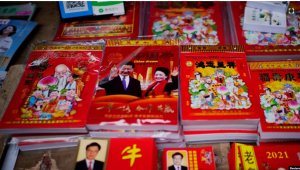 帝王崇拜是传统文化的一部分。图为湖北武汉市场上出售的以中国领导人习近平和夫人彭丽媛画像为封面的2021年日历。(路透社2020年12月7日资料)