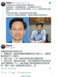 网友@刘志强教授发帖说:不太同意江苏省委省政府涉事方单方面调查,江苏省、市、县存在上下利益关联,应予以回避。其次,此事应由全国人大常委会组成调查委员会进行调查,行使人大监督权。次之也应国务院牵头携其他有关部委进行调查。
