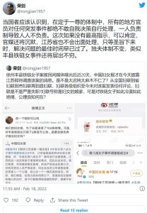 他说:“我们现在看到整个事情是非常戏剧性的,千言万语很难表达。一方面最早由抖音上一些当地的宣传视频把这个事情公开出来,公众哗然。徐州当地警方公布了四份前后不一致、互相矛盾的通告。这种通告的方式本身既不尊重真相本身,也不尊重公众。过去两年,甚至过去十年以来,地方政府应对这些问题已经到了非常不动脑子、非常简单、非常无所谓的一种态度了。公众从当地警方一些很随意的态度,看到事情背后的不简单,这种态度本身是对公众一个巨大的激怒。另外一方面,我们知道现在中国冬奥会,今天北京下了大雪,给这次冬奥会的人工降雪添加了一个自然的气息,但是大雪其实掩盖不了真相。这种戏剧性真的很有意思,大家一方面看到像谷爱凌,像所有光鲜的,过去十年二十年中国经济发展、崛起的这样一种光鲜的景象,但是最后公众发现实际上在徐州丰县这么一个案子背后,中国的底层社会、农村,无论是扶贫还是其他,没有任何变化。这种没有任何变化是公众特别愤怒的原因。这种戏剧性、这种在光鲜外表、强国底下的底层社会,奴役制、奴隶制的丑陋,这种中世纪的残酷,对妇女权益的一种赤裸裸的侵犯,以及地方政府这种随意、不经意、毫无所谓的态度,让人们看到这个社会似乎并没有进步。”