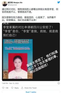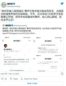 一位网友问道,“能关心一下丰县吗?中央级媒体的责任在哪里?”另一位说,“请彻查徐州铁链女,这样每一位中国女孩都能接受这个伟大时代给予她们的自由和力量,就像谷爱凌那样。”