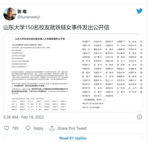 与北大相邻的清华大学的校友也在1月15日发起了联署呼吁行动。截止17日,参与实名联署的人数已达552人。呼吁书写道:下一个铁链女,“也可能就是我们的亲人,甚至是我们自己。”