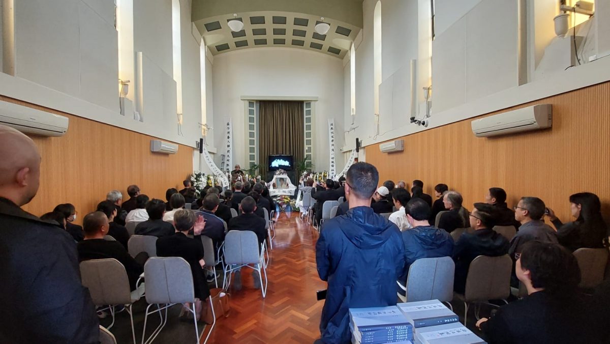 下午2时,灵堂悬挂起挽联“素绢百幅写凄清,谁知沉汩流漓?子笏满堂休名利,待告宇寰宕定!周赧不亡”等,摆满着鲜花,赠送者包括:独立中文笔会、国际汉藏友协、民主中国阵线、纽西兰价值联盟;友人王军涛、王丹、王小选、高健、邢鉴等,以及乡邻陈立群等。追悼会开始播放了逝者生前映像剪辑。