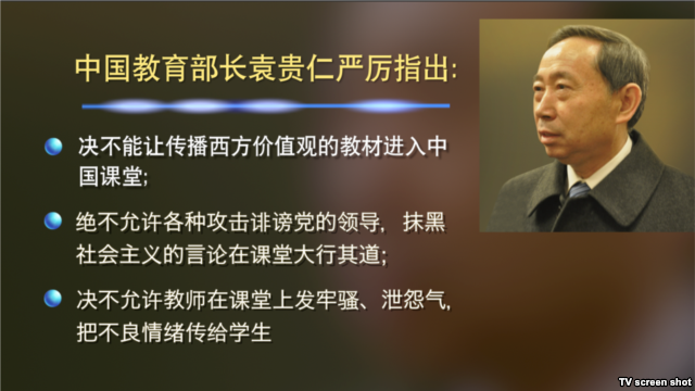 近日,教育部长袁贵仁为了向习中央表忠心,在教育部举办的座谈会上公开强调“绝不能让传播西方价值观念的教材进入我们的课堂。”这番话把一个在党国充当不重要的角儿,从没有引起民众关注的二流小政客,一下子推到了海内外舆论的风口浪尖上。