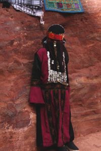 貝都因婦女12年前的春天,我去約旦旅遊,到過古城佩特拉和瓦迪倫沙漠,這兩個地方都是沙漠遊牧民族貝都因人(阿拉伯人一支)的土地,因此我與貝度因人有直接的接觸,發現這個沙漠民族女性的地位在二十一世紀的今天仍然很低,最讓我驚訝的是女性戴面罩規則。約旦沙漠的貝度因女子一到12歲進入青春期就必須戴上只露出眼睛的面罩(asaba),一直到她們青春消失,容貌對男性再無吸引力才可以脫下面罩露出真面目。我在佩特拉見到三個除掉面罩穿一身黑袍的貝都因女子,我打聽後知道她們實際年齡不過40出頭,但在沙漠的風沙和辛苦勞作的煎熬下,面孔皺紋粗深已如溝壑,儼然老婦。