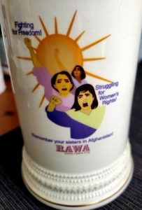 阿富汗女權組織RAWA募款的啤酒杯阿富汗婦女命運很慘,反抗也很悲壯,從未屈服。記得2001年911事件發生後阿富汗婦女悲慘現狀首次受到全球關注,我讀新聞獲知有RAWA這樣一個敢於向命運抗爭,為阿富汗女子爭自由的女權組織,我當時立刻上網購買她們的募款產品,開啟了我第一次的網上購物,其中一個啤酒杯至今仍放在我家中。杯上繪畫的三個阿富汗女子沒穿罩袍戴頭巾,舉拳高呼要自由,並呼籲全世界不要忘記阿富汗的姐妹們。而那時還是塔利班執政時候。