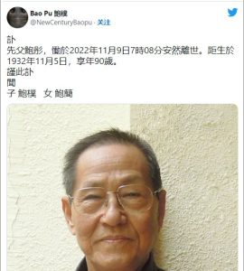 前中共总书记赵紫阳祕书鲍彤的儿子鲍朴今天在社群平台推特(Twitter)发出讣文:“先父鲍彤,恸于2022年11月9日7时08分安然离世。距生于1932年11月5日,享年90岁。”