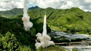 中国电视节目截屏,画面字幕:东部战区火箭军部队对台岛东部外海预定海域实施常导火力突击 全部精准命中目标。-美联社提供照片