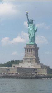 我们的游船穿过两岸林立的高楼之后,来到一片水面宽阔的地区,这是纽约港通向海洋的出口处,远远地就看见竖立在一座小岛上的自由女神像。我等船行到最靠近自由女神像时,连忙搶拍了几张照片。我看到屹立在立方体岩石基座上巨大的青铜自由女神塑像时,只见她身着古希腊女神的服饰,头戴象征七大洲的有七道尖芒的冠冕(七大洲指:亚洲、欧洲、非洲、南美洲、北美洲、南极洲、北极洲),左手抱着美国的独立宣言,右手高举手执象征自由民主的火炬,似乎觉得这尊青铜像铸造得虽然十分完美,但她手举的火炬还不夠长,火炬上的火焰也不够高,使得这火炬的光辉照得还不够远。这使我忽然联想到这是否暗喻,由于这自由民主的火炬举得不够高,以致她那自由民主的光辉至今仍未照亮万里之外的中国大陆?