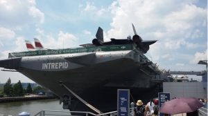 从游船上下来后,我们下一个参观项目就是停靠在游船码头旁边的“无畏号”航母。因为我已在圣地亚哥参观过一艘“中途岛号”航母,再加上此时气温很高,火辣的太阳照得我皮肤发红,本想就在码头阴处坐下来休息一下,不去参观这艘航母了。后听黄导说该航母甲板上不仅有飞机、直升机,还放有一架退役的航天飞机,这使我参观这艘航母的兴趣倍增,我立即改变原来的打祘,决定还是隨团登航母参观。
