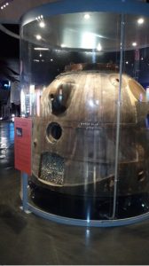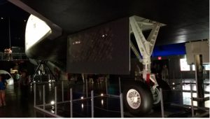 我走进展厅后,登上第二层的参观走道一架厐然大物展现在观众面前,这就是“企业号”航天飞机的实物,由于参观走廊靠航天飞机太近,“企业号”本身又太大,以致在上面无法拍到航天飞机的全貌。我只好走到航天飞机的下面,拍下了它的部份底部和一只起落架。大概是由于航母尾部空间狹小,无法建一个较大的展厅的原因吧!我们还在航天飞机展厅看到了亚特兰蒂斯号航天飞机的仿真模型,以及一个可回收太空艙的实物。