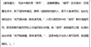 | (黃琉謹注: 毛詩中寫的是“凍死”, 這裏解讀為 “餓死”並非過份:在現實生活中,除了極特殊情況,通常一個能夠吃飽的人,是不大會凍死的,為此杜甫的詩句“朱門酒肉臭,路有凍死骨。”人們大都把其中的“凍死”解作凍餓而死,甚至就解作餓死而和上句強烈對比呼應。倘“凍死”絶無餓死之意,杜甫的詩必然是“朱門袍錦爛,路有凍死骨。”,這是有點文化的人都可設想,無須囉嗦的。)。 |