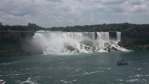 我转了一圈又来到尼亚加拉河边,看到许多游客在排队,原来美国人为了克服在美国一侧看瀑布,因视角不好无法看到瀑布全貌的缺陷,在尼亚加拉河边的悬崖上修建了一座巨大的钢架,一直伸到河中心,钢架的顶端修建了一座观景平台,人们排队买票便可依次登到观景平台上去观看尼亚加拉大瀑布。在这个观景台上不仅可以看到美国的亚美利加瀑布和新娘面纱瀑布的全貌,而且连加拿大一侧的马蹄瀑布也一览无遗(只是因距离较远,没有在加拿大一侧近距离观看那么清楚、那么惊心动魄)。