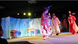 开演后熟悉的锣鼓声伴隨着身着华丽服饰的印地安男女翩翩起舞,旁边居然还有一位头戴羽冠的中年男印地安人,在用一种箫一样的竹制乐器进行吹奏。看那些载歌载舞的印地安人,除了头上特有的印地安人羽毛头饰之外的梳妆打扮和服饰,与我国许多信奉萨满教的少数民族的萨满教巫师的衣着打扮几乎一模一样,也有点像京剧里面的服饰。印地安人的舞蹈动作与萨满教巫师以及我国一些少数民族巫师跳大神的动作也几乎没有什么区别 。