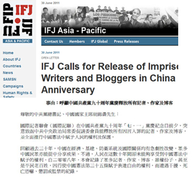 国际记者联会在中共九十周年生日前夕,致函中共中央政治局常委促请释放所有因言入罪的记者、作家及博客,并全面推行中国宪法中赋予人民的权利及保护。