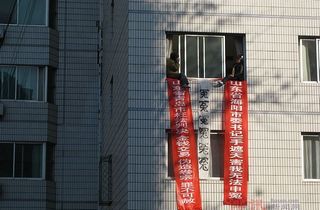 山东青岛杨秀荣、海阳市徐永峰北京西郊招待所跳楼、撒传单11月30日山东二女访民,为抗议自己冤情无处投诉,在北京京西招待所欲跳楼自杀。当日上午,来自山东青岛市四方区女访民徐永峰,海阳市女访民杨秀荣(她丈夫杨全永因为举报腐败被残忍杀害,请看图文报道),在北京京西招待所她们下榻的五楼房间内,从窗口挂出三幅横幅,并抛洒出大量冤情传单,二人数次站在窗台上,非常惊险。当地警察、消防出动20余人多部车辆,经过三个多小时谈判,最后警方动用消防云梯,升空强行将杨秀荣、徐永峰的喊冤终止。博讯义工全程拍摄了视频。(博讯当日曾发表短视频,但不清楚事件细节)