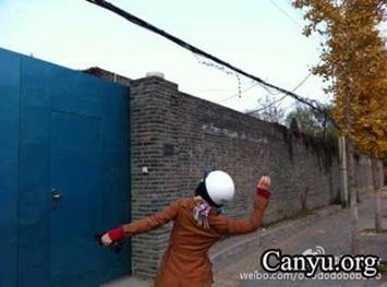网友在艾未未工作室大院外,向墙内投掷钱币折叠的纸飞机。