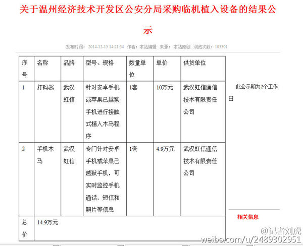 这个故事很多人应该都听过,出自《资治通鉴·唐太宗贞观二年》,原文很简单,“上(唐太宗)问魏徵曰:‘人主何为而明,何为而暗?’对曰:‘偏信则暗,监听则明,’”。于是熟读《资治通鉴》的温州经济技术开发区公安分局就购买了一套监听设备,准备广泛监听取一下民意。温州经济技术开发区官网12月15日发布文章《关于温州经济技术开发区公安分局采购临机植入设备的结果公示》,根据公示,温州经济技术开发区公安分局花费4.9万元,购入“专门针对安卓手机或苹果已越狱手机,可实时监控手机通话,短信和照片等信息”的手机木马,花费10万元购入“针对安卓手机或苹果已越狱手机进行接触式植入木马程序”的打码器。此时此刻,相信这条新闻网上已经很多了,图如下,多方验证,不是P的。