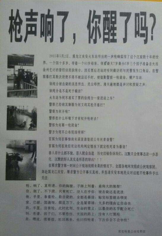 黑龙江庆安县火车站候车厅一声枪响,射穿了无辜访民徐纯合的心脏,也了击碎了很多国民对中共暴政的最后一丝幻想,海内外为之震动,凡稍有良知者,听闻此事,无不义愤填膺,很多人在力所能及的范围内,联署签名,追索真相,呼唤正义,揭批邪恶,讨伐专制,捐助徐母,誓言惩凶。自屠夫吴淦揭开枪杀徐纯合案的黑幕一角之后,民间良知人士纷纷奔赴庆安,现场博弈,当面支援。谢燕益、李仲伟、刘书庆、谢阳四位律师,不远千里奔赴庆安,获得了徐纯合母亲对徐纯合案件的代理授权,积极展开进一步行动,当律师们对杀人警察等人的立案问责要求被黑龙江政法系统拒绝之后,迎难而上,举牌抗议。与此同时,“徐纯合被枪杀案”各地观察团和援助者源源不断赶赴庆安……一时之间,庆安成为大陆舆论焦点、维权焦点、博弈焦点。在“徐纯合被枪杀案”所引发的震动和压力下,庆安体制内外对中共政权长期倒行逆施和专制腐败统治与日俱增的怨愤,“如怒涛排壑,不可遏抑”,庆安政局发生了一系列令人振奋的变化。