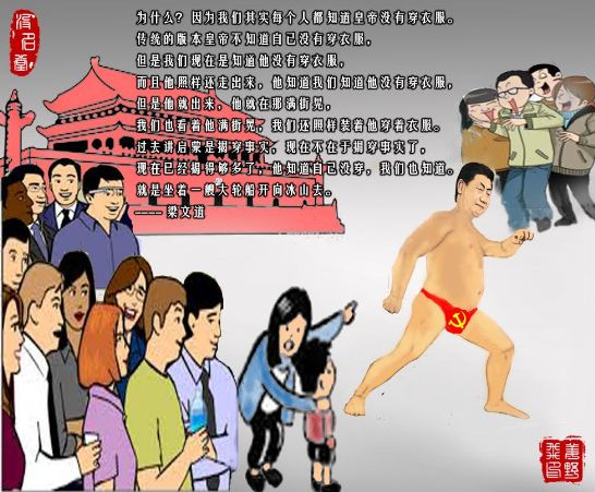 为什么?因为我们其实每个人都知道皇帝没有穿衣服。传统的版本皇帝不知道自己没有穿衣服,但是我们现在是知道他没有穿衣服,而且他照样还走出来,他知道我们知道他没有穿衣服,但是他就出来,他就在那满街晃,我们也看着他满街晃,我们还照样装着他穿着衣服。过去讲启蒙是揭穿事实,现在不在于揭穿事实了,现在已经揭得够多了,他知道自己没穿,我们也知道。就是坐着一艘大轮船开向冰山去。